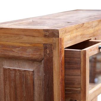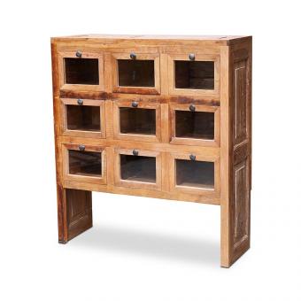 Vitrinenschrank mit 9 verglasten Schubladen. Die Seitenteile sind aus alten Türen gefertigt.