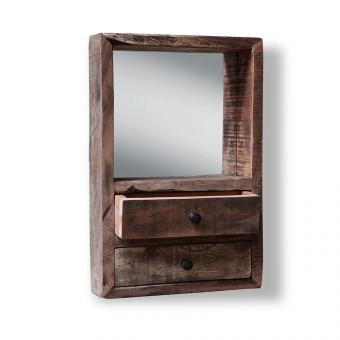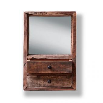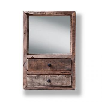 Spiegel aus recycelten Hölzern mit zwei kleinen Schubladen.
