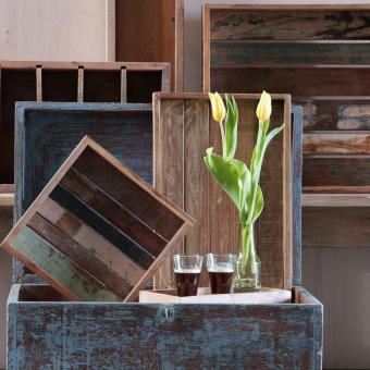 Einfaches flaches Tablett mit herausnehmbaren Einteilungen. Hier wurde hauptsächlich recyceltes helles Holz verwendet. Die Oberfläche ist rau. Die Anzahl der herausnehmbaren Einteilungen kann variieren.